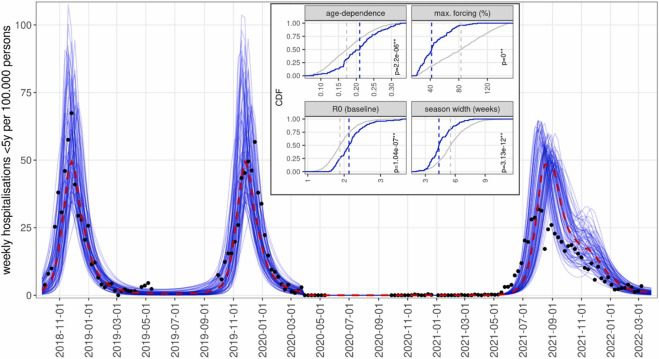 Fig 2. Simulations of RSV resurgence from June 2021, assuming gradual recovery of contact levels from March 2021, showing the 10% of simulations with the lowest error with respect to SARI-Watch hospitalization rates. Source: Koltai, M. K.-S. (2022). Determinants of RSV epidemiology following suppression through pandemic contact restrictions. Epidemics, 40.
